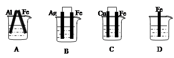 本题解析:原电池的形成条件:1、有两种活泼性不同的金属(或其中一种为非金属导体)作电极;2、电极均插入电解质溶液中;3、两极相互连接(或接触);4、能自发的发生氧化还原反应。据此可知选项ABC均能形成原电池。其中金属性是Al>Fe>Cu>Ag,所以在ABC中铁分别是正极、负极、负极,答案选A。