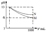 5、选择题 pH=13的两种碱溶液M、N各1mL,分别加水稀释到1000mL,其pH与溶液体积(V/mL)的关系如图所示,下列说法正确的是