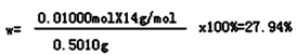 ①称取样品0.5010g,加入过量的NaOH溶液,煮沸,蒸出所有的氨,冷却,得到A。产生的氨用50.00mL0.5000mol·L-1的盐酸完全吸收并用蒸馏水定容至100mL,得溶液B。取B溶液20.00mL, 用0.1000mol·L-1NaOH滴定,消耗NaOH溶液30.00mL。