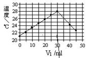 1、选择题 (6分)将V1 ml? 1.0 mol/L HCl溶液和V2 ml未知浓度的NaOH溶液混合均匀后测量并记录溶液的温度,实验结果如图所示(实验中始终保持V1+V2="=50" ml)。下列叙述中不正确的是