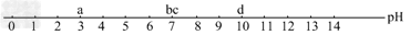 (3)某同学郊游不慎被蜜蜂蜇伤,已知蜜蜂蜇人时分泌的液体是酸性的.该同学随身携带的物品有苹果汁、牛奶、矿泉水和香皂等,其pH分别为a、b、c、d(如下图所示,d为香皂水的pH),为了减轻蜇伤处的疼痛,应涂沫 ( ) ?