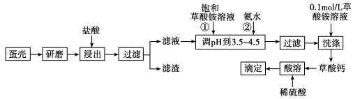 3、填空题 (10分)蛋壳的主要成分是CaCO3,其次是SiO2、MgCO3及色素等杂质,测定蛋壳中钙的含量时常涉及如图操作步骤,其中最后滴定操作是用标准酸性高锰酸钾溶液滴定生成的草酸,通过钙与草酸的定量关系,可间接求出钙的含量。