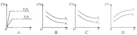 2C(g)△H<0,随不同温度(T1>T2)。不同压强(P2>P2)或不同时间(t),混合气中C的体积分数C%变化的曲线中,下列图像错误的是(?)