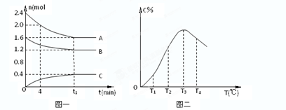 1、选择题 在10L密闭容器中,A、B、C三种气态物质构成了可逆反应的体系;当在某一温度时,A、B、C物质的量与时间的关系如图一,C的百分含量与温度的关系如图二。