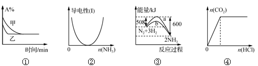 本题解析:A、该反应为体积缩小的反应,增大压强,平衡正移,但甲乙两曲线平衡状态相同,故该图不应是压强的影响,而应是催化剂的影响,错误;B、乙酸为弱电解质,其中通入氨气后导电能力逐渐增强,错误;C、由图可知,反应物的总能量大于生成物的总能量,为放热反应,b曲线表示反应的活化能降低,说明加入了催化剂,正确;D、碳酸钠溶液中加入盐酸,刚开始不会生成二氧化碳气体,错误;故本题选择C。