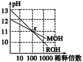 5、选择题 MOH和ROH两种一元碱的溶液分别加水稀释时,pH变化如下图所示。下列叙述中正确的是
