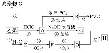 2、填空题 工业上用乙烯和氯气为原料合成聚氯乙烯(PVC)。已知次氯酸能跟乙烯发生加成反应:CH2=CH2+HOCl→CH2(OH)CH2Cl。以乙烯为原料制取PVC等产品的转化关系如下图所示。