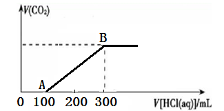 3、填空题 向200 mL 某物质的量浓度的NaOH溶液中缓慢通入一定量的CO2,充分反应后,得到Na2CO3和NaHCO3的混合溶液。向上述所得溶液中,逐滴滴加2 mol·L-1的盐酸,所得气体的体积与所加盐酸的体积关系如图所示: