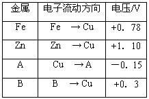 5、填空题  (9分)将洁净的金属片Fe、Zn 、A、B 分别与Cu用导线连结浸在合适的电解质溶液里。实验并记录电压指针的移动方向和电压表的读数如表所示: