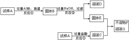 4、简答题 试样A是由氧化铁和氧化铜组成.取质量相等的两份试样按下图进行实验,最后得到不溶物F和溶液G,不溶物F加入盐酸能放出气体.