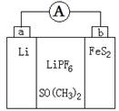 2、选择题  如图是一种应用广泛的锂电池,LiPF6是电解质,SO(CH3)2是溶剂,反应原理是4Li+FeS2=Fe+2Li2S。下列说法正确的是