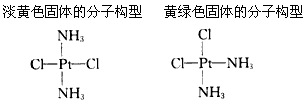 1、填空题  极性分子易溶于极性分子中,而非极性分子易溶于非极性分子中,又叫相似相溶原理。PtCl2(NH3)2为平面正方形结构,它可以形成两种固体:一种为淡黄色,在水中溶解度小;另一种为黄绿色,在水中溶解度较大,请在以下空格中画出这两种固体分子的几何构型图:淡黄色固体的分子构型黄绿色固体的分子构型