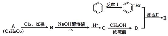 本题解析:(1)符合A分子式的羧酸有CH3CH2CH2COOH、(CH3)2CHCOOH,由已知反应类比或仿写,前者发生取代反应可生成CH3CH2CHClCOOH或CH3CHClCH2COOH,后者发生取代反应可生成(CH3)2CClCOOH,CH3CH2CHClCOOH、CH3CHClCH2COOH、(CH3)2CClCOOH含有的氢原子种数分别有4、4、2种,根据题意可知B为(CH3)2CClCOOH,则A为(CH3)2CHCOOH;2(CH3)2CHCOOH+2Na→2(CH3)2CHCOONa+H2↑,则0.1molA与足量Na反应产生0.05mol H2,V(H2)=0.05mol×22.4L/mol=1.12L;(2)由物质转化前后结构变化推断,I的目的是制备溴苯,则苯与液溴在铁或溴化铁催化下,发生取代反应生成溴苯和溴化氢;(3)略;(4)根据反应条件可知C为CH2=C(CH3)COOH,D为CH2=C(CH3)COOCH3,E为C6H5CH=C(CH3)COOCH3;(5)F的分子式为C4H8O2,根据反应条件及产物的结构简式,采用逆推结合顺推,则发生消去反应的F为HOCH2CH(CH3)CHO,而发生催化氧化反应生成的C为CH2=C(CH3)COOH,判断反应III是否完全反应的本质是判断是否含有醛基,因此应该先选NaOH溶液中和CH2=C(CH3)COOH,至溶液呈碱性后再加入新制氢氧化铜悬浊液或银氨溶液,然后加热,若产生红色沉淀或银镜,说明还存在醛基,说明反应III没有反应完全,反之则说明反应III已经完全反应。