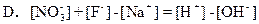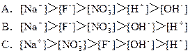 则溶液中[Na+]0.2 mol/L,[F-]="0.1" mol/L<0.2 mol/L,[NO3-]0.1 mol/L,[H+]<0.1 mol/L 溶液显弱酸性[H+]>[OH-],D选项:由正负离子浓度相等知。