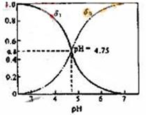 分配系数是指弱电解质溶液中,溶质某种型体浓度与溶质型体总浓度的比值。分配曲线是指弱电解质溶液平衡状态时,每种型体浓度的分配系数与PH之间的关系曲线。对于CH3COOH总浓度c,它只有两种型体,平衡浓度分别为c(CH3COOH)、c(CH3COO-),则c= c(CH3COOH)+c(CH3COO-),设CH3COOH所占分配系数为δ1,CH3COO-所占分配系数为δ0,它们与PH的关系如图所示。下列有关说法正确的是(? )