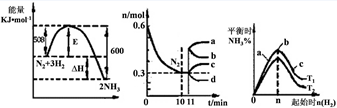 (2)一定的条件下,合成氨反应为:N2(g)+3H2(g) ?2NH3(g)。图1表示在此反应过程中的能量的变化,图2表示在2L的密闭容器中反应时N2的物质的量随时间的变化曲线。图3表示在其他条件不变的情况下,改变起始物氢气的物质的量对此反应平衡的影响。