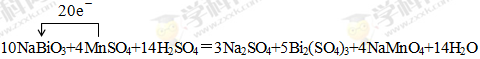 (3)①反应中NaBiO3→Bi2(SO4)3,Bi元素化合价由+5价降低为+3价,得到2个电子,因此生成1mol Bi2(SO4)3得到4mol电子。MnSO4→NaMnO4,Mn元素化合价由+2价升高为+7价,失去5个电子。因此根据电子得失守恒可知,Bi2(SO4)3系数为5,MnSO4系数为4。根据原子守恒可知,NaBiO3的系数为10,NaMnO4系数为4。根据钠原子守恒可知Na2SO4的系数为3。根据硫酸根守恒可知H2SO4的系数为14。根据氢元素守恒可知H2O的系数为14,所以配平后的化学方程式为10NaBiO3+4MnSO4+14H2SO4=3Na2SO4+5Bi2(SO4)3+4NaMnO4+14H2O。其中标出电子转移的方向和数目为: