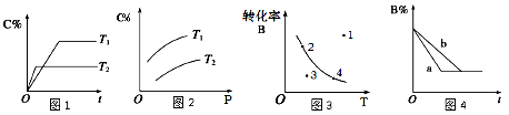 本题解析:A.由图1可知,温度在T2时首先达到平衡。说明T1<T2,升高温度,化学反应速率加快,达到平衡所需要的时间缩短。因为在温度为T2时C%减小。说明升高温度,化学平衡向逆反应方向移动。逆反应方向为吸热反应,所以该反应正反应为放热反应。错误。B.由图2可知,在温度不变时,增大压强,C%增多。说明增大压强,化学平衡向正反应方向移动。根据平衡移动原理,增大压强,化学平衡向气体体积减小的方向移动,正反应方向为气体体积减小的方向。所以该反应m+n>p。错误。C.图3表示的是在不同的温度下,当反应达到平衡时反应物B的转化率与温度 的关系。曲线上的点表示的是平衡状态,v正=v逆。过3这一点作横坐标的垂下,交曲线与一点。这点的B的转化率高于3这一点,说明3未达到平衡,反应向正反应方向进行,此时表示的反应速率v正>v逆的是点3。正确。D.图4中,若m+n=p,则a曲线达到平衡所需要的时间比b短,先达到平衡。则可能是使用了催化剂,也可能是增大了压强,缩小了容器的容积。错误。