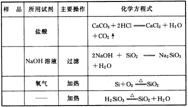 3、填空题 欲除去下表中各粉末状混合物中的杂质(括号内为杂质),请填写所用的试剂、操作名称及化学方程式。