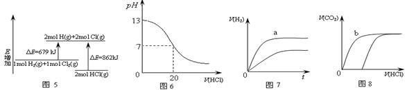 C.图7表示体积和pH均相同的HCl和CH3COOH两种溶液中,分别加入足量的锌,产生H2的体积随时间的变化,则a表示CH3COOH溶液