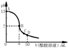 B.在B点,a>25,且有c(Na+)=c(CH3COO-)>c(OH-)=c(H+)