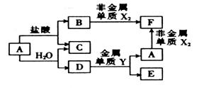 2、填空题 (14分)A、B、C、D、E、F六种的转化关系如右图,其中A为应用最广泛的金属,氧化物E既能与盐酸反应,又能与NaOH溶液反应。X、Y属于同一周期,且核电荷数相差4。