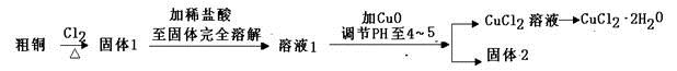 5、填空题 氯化铜是一种广泛用于生产颜料、木材防腐剂等的化工产品。某研究小组用粗铜(含杂质Fe)按下述流程制备氯化铜晶体(CuCl2·2H2O)。