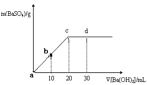 2、填空题 常温下,向0.25mol/L的硫酸溶液中逐滴加入物质的量浓度相同的氢氧化钡溶液,生成沉淀与加入氢氧化钡溶液的体积关系如图所示,a、b、c、d分别表示实验不同时刻的溶液。