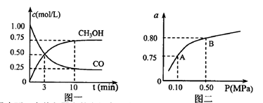 (3)若某温度下反应①从开始到平衡CO和CH3OH的浓度变化如图一所示,则用H2浓度变化表示此段时间内该反应的平均速.v(H2)=?若某温度下反应①中H2的平衡转化率(a)与体系总压强(P)的关系如图二所示,则平衡状态由A变到B时,平衡常数
