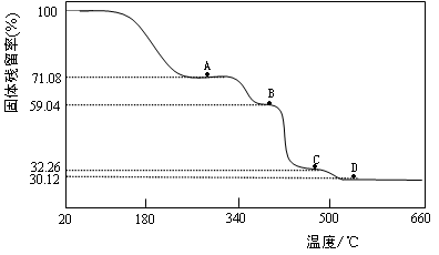 (3)为确定Co(CH3COO)2·nH2O中的n值及其热分解过程,取一定量的样品在氮气氛围中加热,样品的固体残留率()随温度的变化如下图所示(样品在300℃前失去结晶水,图中A、B、C、D各处固体均为纯净物,其中C、D为氧化物)。
