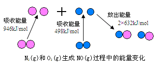 2、填空题 化学反应中的能量变化,是由化学反应中旧化学键断裂时吸收的能量与新化学键形成时放出的能量不同所致。下图为N2(g)和O2(g)生成NO(g)过程中的能量变化