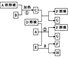4、填空题 下图为物质A~I的转化关系(部分反应物、生成物没有列出)。其中B为某金属矿的主要成分,经过一系列反应可得到E和F。D、E常温下为气体,D、F为常见单质,单质F可与H的浓溶液加热时发生反应。