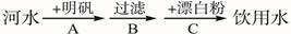 A中加入明矾的作用是??,能够消毒杀菌的步骤是 _________ , 可以除去较大颗粒、悬浮物的步骤是_________ , 漂白粉的有效成分是(写化学式)? ______________。
