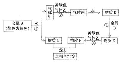 1、填空题 (12分)现有金属单质A、B和气体甲、乙、丙以及物质C、D、E、F,它们之间能发生如下反应。(图中有些反应的产物和反应条件没有标出)