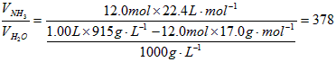 3、计算题 标准状况下,用一定量的水吸收氨气后制得浓度为12.0mol·L-1、密度为 0.915g·cm-3的氨水。试计算1体积水吸收多少体积的氨气可制得上述氨水。(本题中氨的式量以17.0计,水的密度以1.00g·cm-3计)