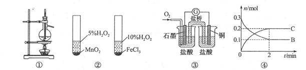 本题解析:A、分离沸点相差较大的互溶液体混合物用蒸馏的方法,温度计水银球应位于蒸馏烧瓶支管口处,错误;B、研究不同催化剂对反应速率的影响应保证H2O2的浓度相同,错误;C、图③形成原电池,电流计的指针发生偏转,错误;D、对反应:结合图④分析知反应达平衡后B和C的物质的量变化相同,可以求出x=2,正确。