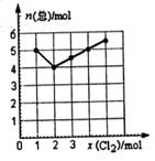 (4) Cl2与NO2在一定条件下发生化合反应,生成一种气体,实验数据如图。图中横坐标是加入C12的物质的量,纵坐标是反应后气体物质的量总和。已知所取C12、NO2的物质的量总和为6 mol。则生成物的化学式是__________。