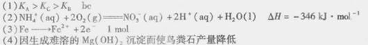 (4)废水中的N、P元素是造成水体富营养化的主要因素,农药厂排放的废水中。常含有较多的NH4+和PO43-,其中一种方法是:在废水中加人镁矿工业废水,可以生成高品位的磷矿石——鸟粪石,反应的离子方程式为Mg2++NH4++PO43-?MgNH4PO4↓。该方法中需要控制污水的pH为7.5—10,若pH高于l0.7,鸟粪石产量会降;低,其原因可能是?