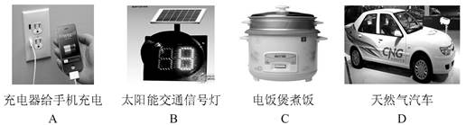 本题解析:充电是将电能转化为化学能,A对;太阳能交通灯是将太阳能转化为电能,电能再转化为光能,,B错;电饭煲煮饭是将电能转化为热能,C错;天然气汽车是将化学能转化为电能,D错。
