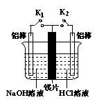 2、选择题 在一电解槽的中间加一镁片将其分成隔开的两部分,左侧加适量的NaOH溶液,并插入一根铝棒,右侧加适量的浓HCl,并插入一根铝棒。如图所示,下列有关说法中不正确的是(?)