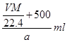 3、选择题 在标准状况下,将A气体V L (摩尔质量是M g·mol-1)溶于0.5 L水中,所得溶液的密度为a g·cm-3,则此溶液的物质的量浓度为(mol·L -1)