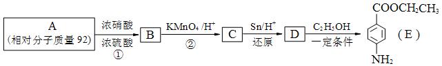 2、填空题 (12分)苯佐卡因是一种医用麻醉药品,学名对氨基苯甲酸乙酯。用芳香烃A为原料合成苯佐卡因E的路线如下: