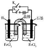 本题解析:闭合K2断开K1后,就形成的是一个电解池,根据电源的正极可知铁电极应该是阳极,是一个活性阳极,应该是铁失去电子,阳离子应该移动到阴极,故A的分析不合理;闭合K,断开K2,形成的是一个原电池,电子从负极出发到正极,铁失电子为负极,故电流方向从石墨电极经过K.流向铁电极,亚铁离子被空气中氧气氧化成铁离子,水解能力增强,故酸性增强,溶液pH将逐渐降低