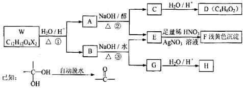 3、填空题 (15分)有机物W~H有如下的转化关系。已知W、B为芳香族化合物,X为卤素原子,W、A、B均能与NaHCO3溶液反应,A分子中有2个甲基,H分子中含有醛基和苯环且H分子苯环上的一氯取代物只有两种