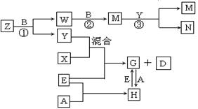 4、填空题 A、B、C、D、E是五种中学常见的单质,已知A、B、C、D在常温下均为气态,其中D能分别跟A、B、C在一定条件下两两化合,生成化合物X、Y、Z;A与B、C均不能直接化合,有关的转化关系如下图所示(反应条件均已略去)回答下列问题: