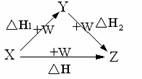 5、选择题 X、Y、Z、W有如下图所示的转化关系,已知焓变:ΔH=ΔH1+ΔH2,则X、Y不可能是?(?)