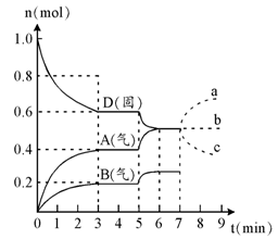 4、若在第7分钟时增加D的物质的量,A的物质的量变化正确的是?(用图中a、b、c的编号回答)