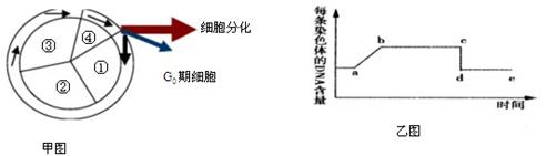 5、选择题 下图图甲为细胞周期示意图,其中①、②、③代表间期连续的三个时期,④代表分裂期;G0期细胞表示分裂结束后细胞的去路之一,即细胞暂时不分裂,但在一定条件下可恢复分裂能力。下图图乙为细胞分裂过程中每条染色体上DNA变化规律曲线。下列叙述正确的是