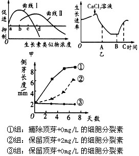 (2)研究人员用一定浓度的CaCl2溶液和赤霉素对某植物种子胚轴生长的影响进行了相关实验,结果如乙图所示。由图可知,一定浓度的CaCl2溶液对胚轴的生长具有_______作用。根据赤霉素的生理作用推测,实验中加入赤霉素溶液的时间应在图中的_______点。