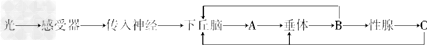 (2)上面图解中的A、B、C分别代表由下丘脑、垂体和性腺分泌的物质,则它们分别是_________、_________和_________。C进入血液后,通过__________作用来调节下丘脑和垂体中激素的合成和分泌。